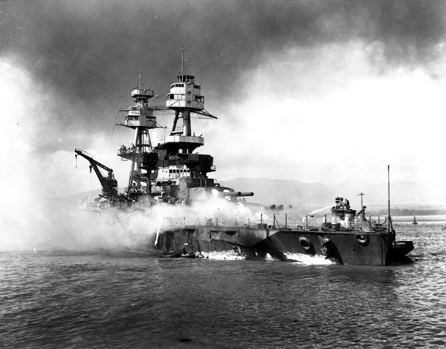Another iconic photo from that day, the USS Arizona lists to its side after being bombed.
