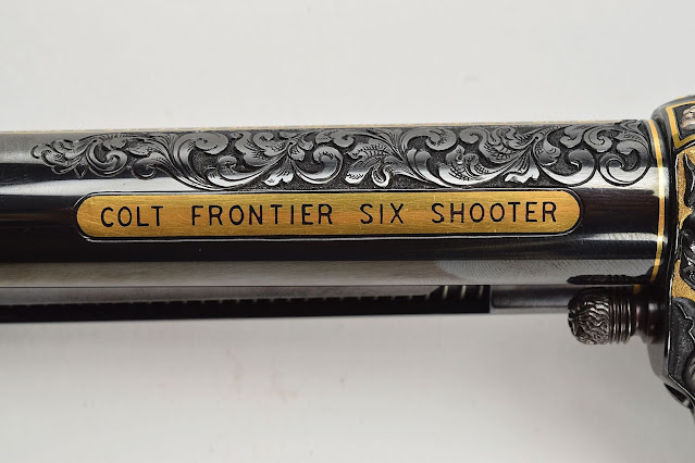 Together they chose a Colt Frontier Six Shooter Centennial Peacemaker, made in 1973 to celebrate the 100th anniversary of the introduction of the Single Action Army revolver. This model was chosen due to its unfluted cylinder which gave the artist more room to work. Gold, silver and copper were used in the inlays.
